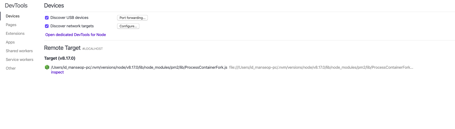 1. node.js로 서비스를 실행할때 "--inspect" 옵션을 주고 서비스를 실행