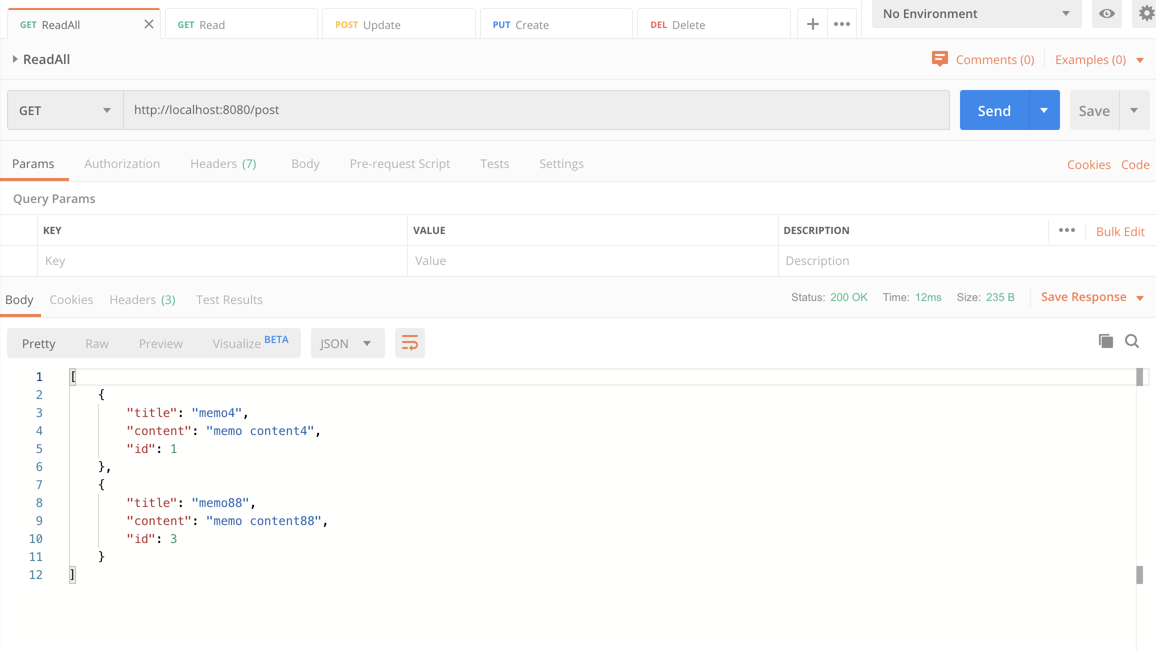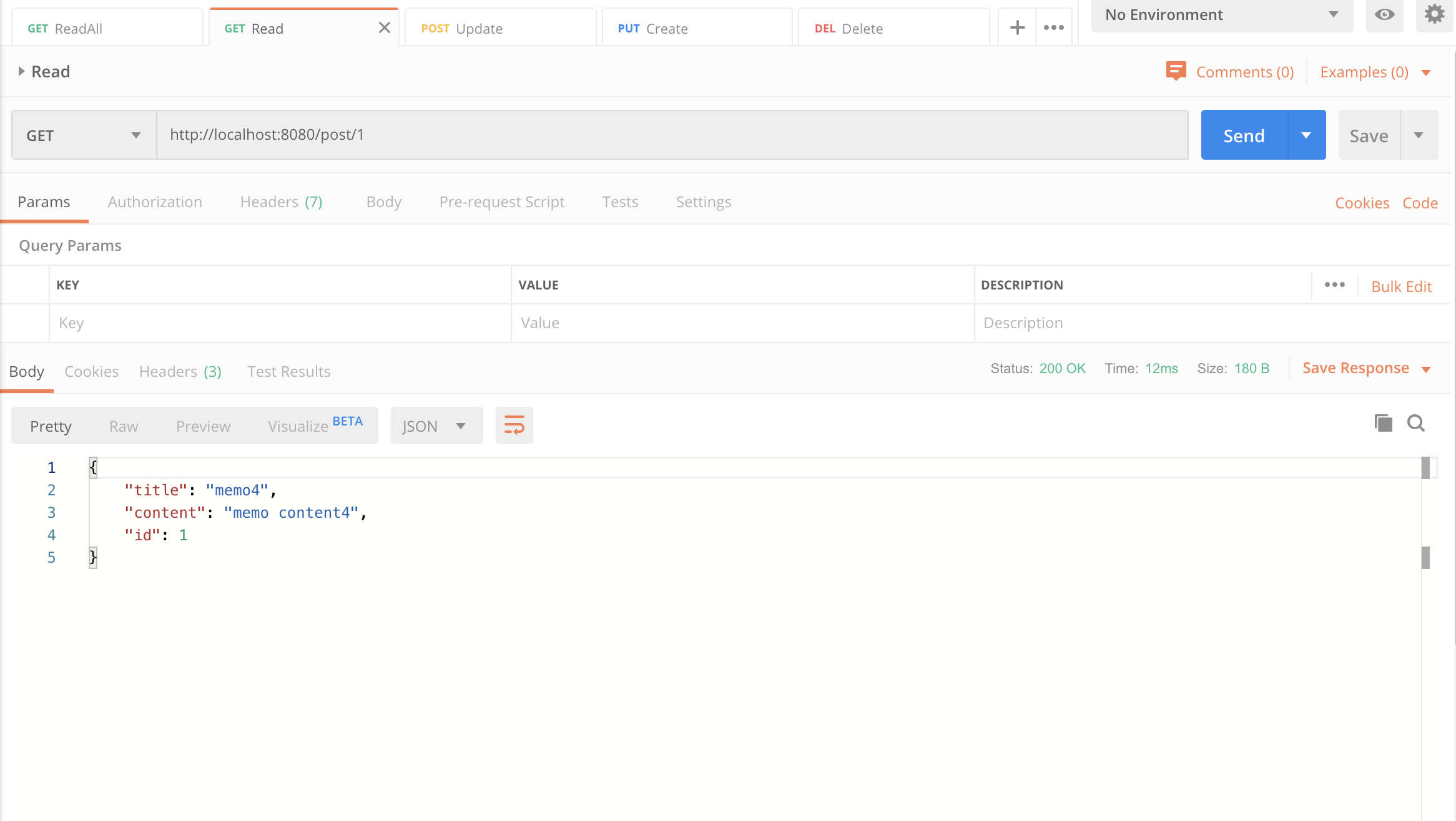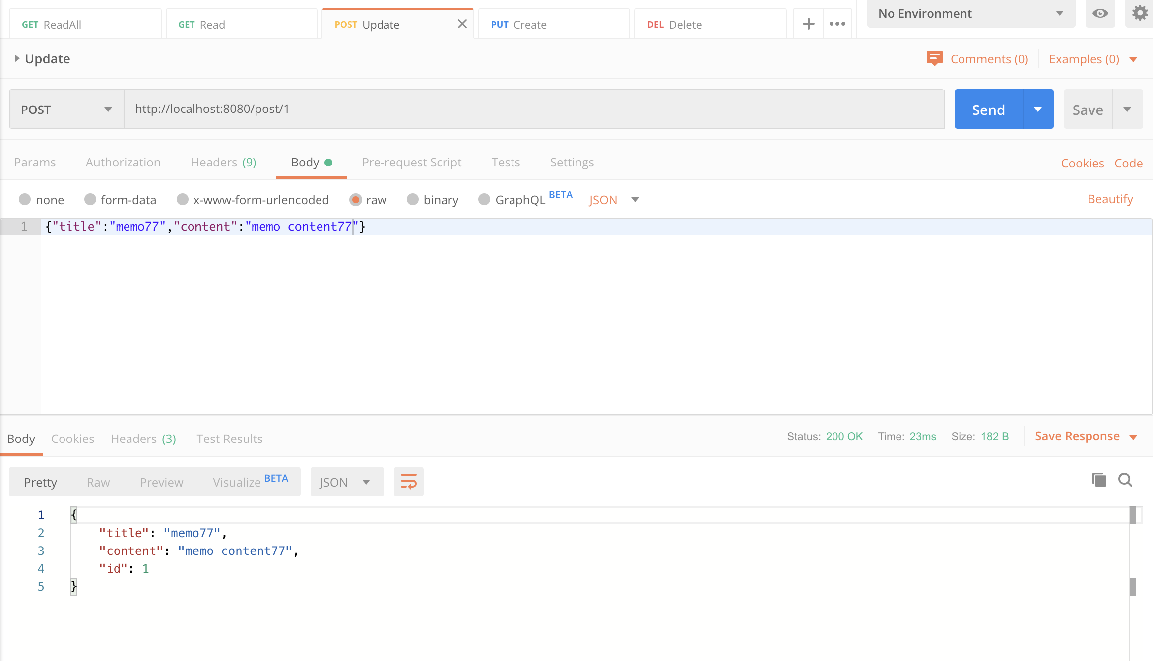 이제 스프링을 실행시키고 Postman 을 이용해서 아래와 같이 테스트를 수행해보도록 하자.