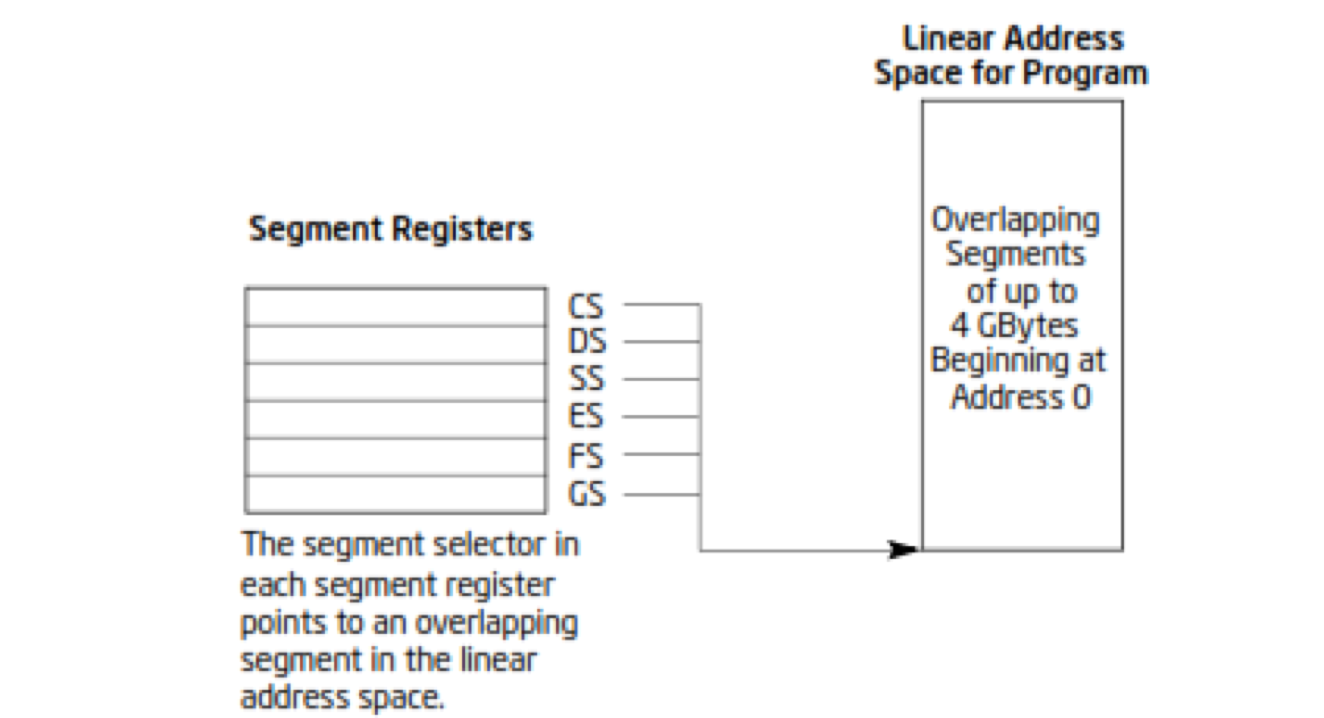 첫번째로는, Flat Memory Model이다. Flat Model과 같은 경우 코드나 데이터 영역이(세그멘테이션 같이) 따로 영역이 나누어지지 않아서, 32bit 기준으로, 0~2^31-1 byte 에 해당하는 영역을 별 다른 제한 없이 모든 메모리 영역을 가리킬 수 있다. 여담으로, 해당 메모리모델에서의 주소를 선형 주소라고 부른다.