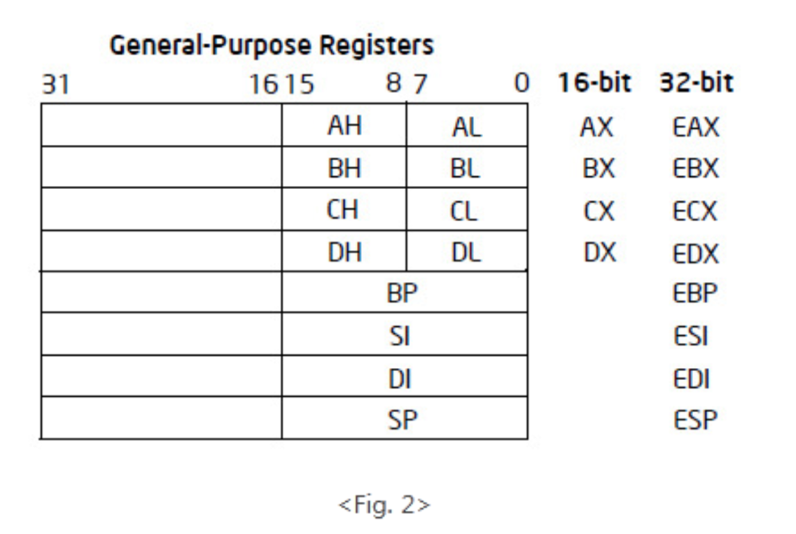(EAX : 32bit / AX : EAX의 하위 16bit / AH : AX의 상위 8bit / AL : AX의 하위 8bit)