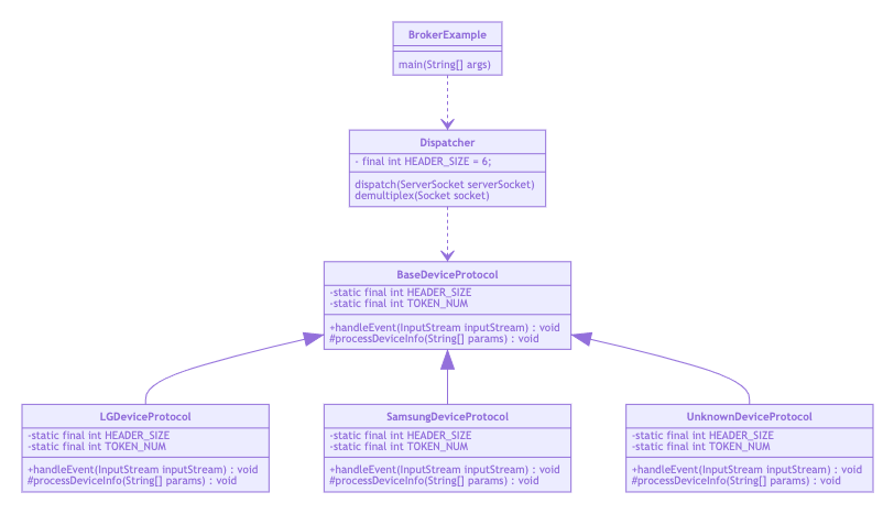 Dispatcher 클래스는 클라이언트로 부터 래핑된 프로토콜을 받아서, 프로토콜의 헤더가 어떤거냐에 따라 그에 맞는 적절한 핸들러를 호출해주는 역할을 수행합니다.